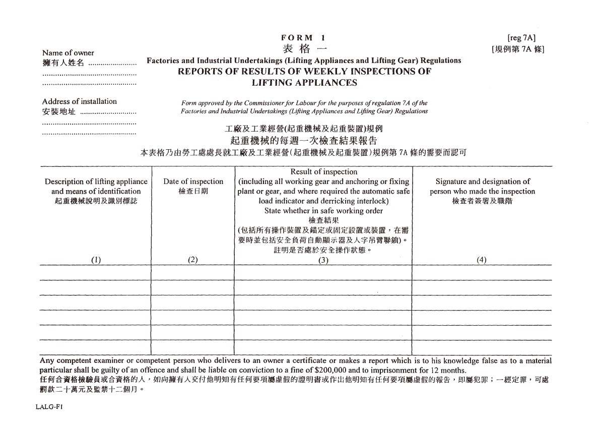 FORM1 | Reports of Results of Weekly Inspections of Lifting Appliances